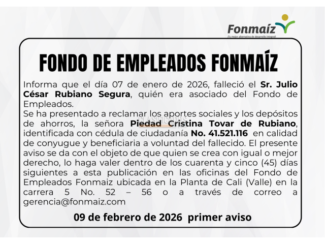 Informa que el día 07 de enero de 2026, falleció el Sr. Julio César Rubiano Segura, quién era asociado del Fondo de Empleados. Se ha presentado a reclamar los aportes sociales y los depósitos de ahorros, la señora Piedad Cristina Tovar de Rubiano, identificada con cédula de ciudadanía No. 41.521.116 en calidad de conyugue y beneficiaria a voluntad del fallecido. El presente aviso se da con el objeto de que quien se crea con igual o mejor derecho, lo haga valer dentro de los cuarenta y cinco (45) días siguientes a esta publicación en las oficinas del Fondo de Empleados Fonmaiz ubicada en la Planta de Cali (Valle) en la carrera 5 No. 52 – 56 o a través de correo a gerencia@fonmaiz.com